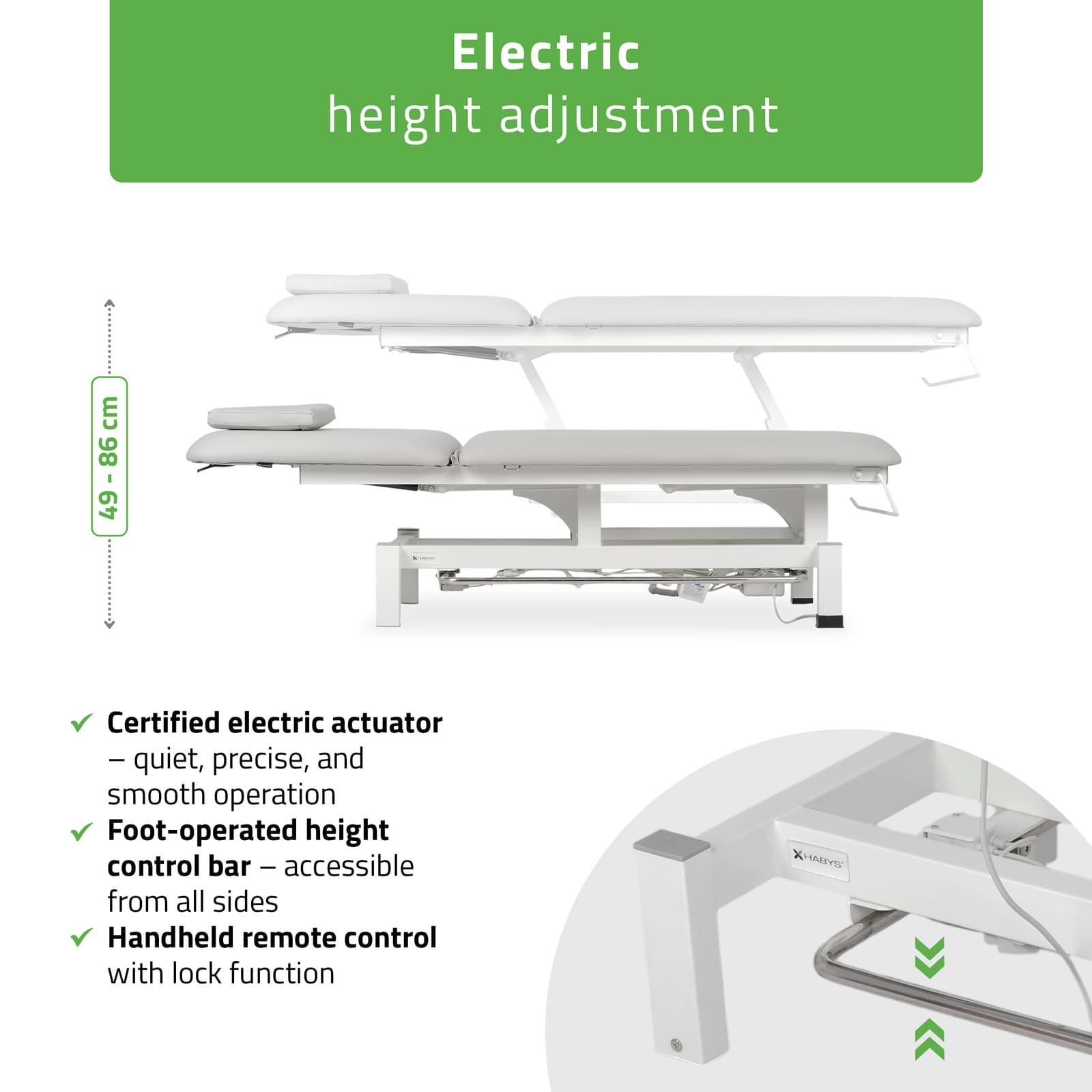 Fortis 2 masāžas galds ir aprīkots ar klusu, sertificētu elektrisko piedziņu, kas ļauj precīzi regulēt augstumu no 49 cm līdz 86 cm, nodrošinot terapeita komfortu un pacienta ērtības.