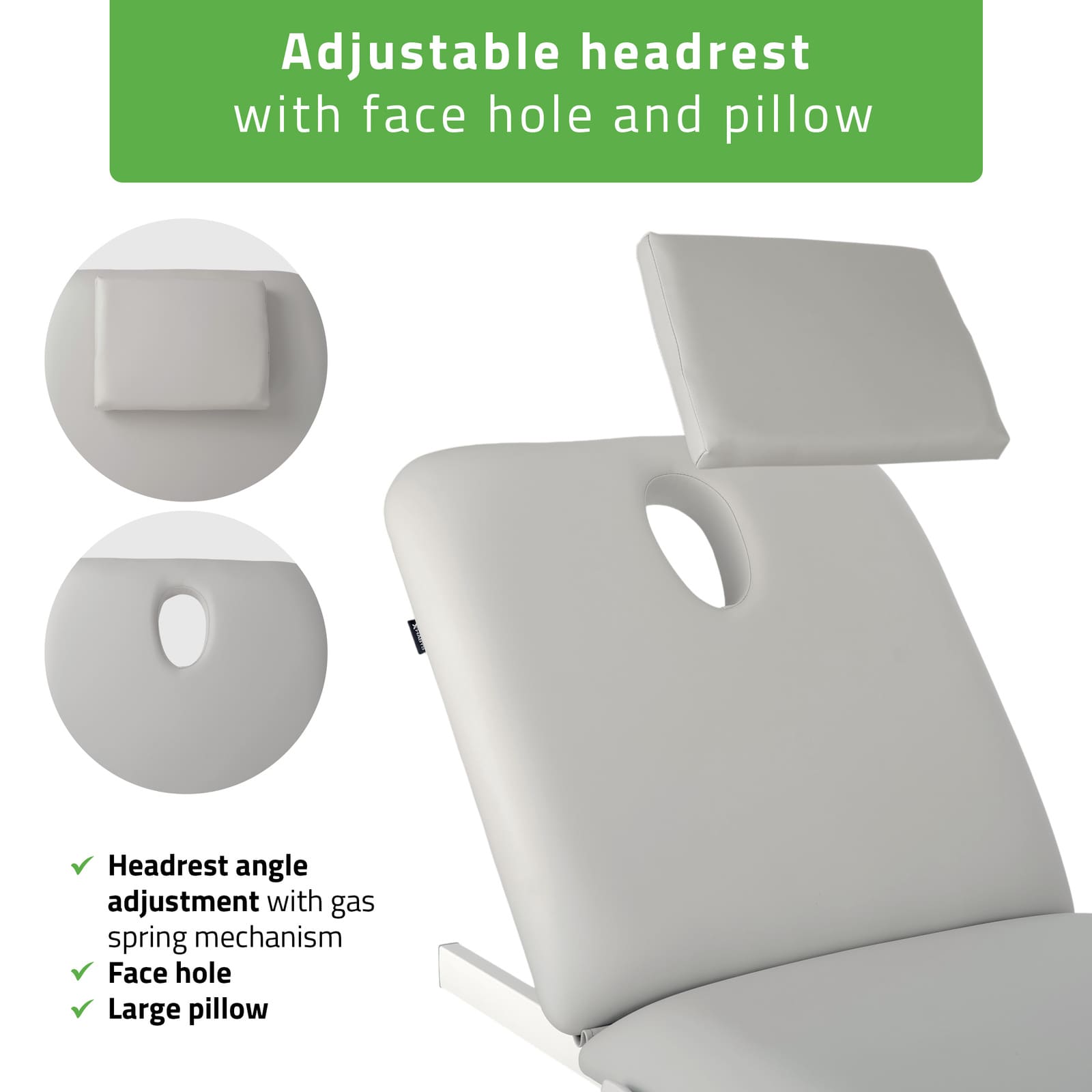 Regulējama atzveltne ar sejas atveri un galvas spilvenu: Atzveltnes slīpuma leņķis ir regulējams, un gāzes atsperes mehānisms nodrošina klusu un precīzu pacienta pozicionēšanu atbilstoši terapijas vajadzībām. Sejas atvere galdā ļauj brīvi elpot “guļus” pozīcijā. Liels spilvens nepieciešamības gadījumā nosedz atveri, nodrošinot pacientam komfortu “guļus” vai sānu pozīcijās.