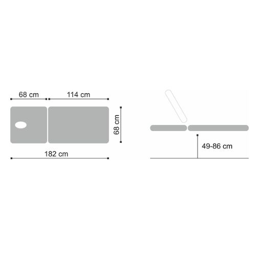 • Divdaļīga virsma: Galvas balsts un galvenā virsma (182 cm x 68 cm), galvas daļas regulācija nodrošina pareizu kakla pozicionēšanu.