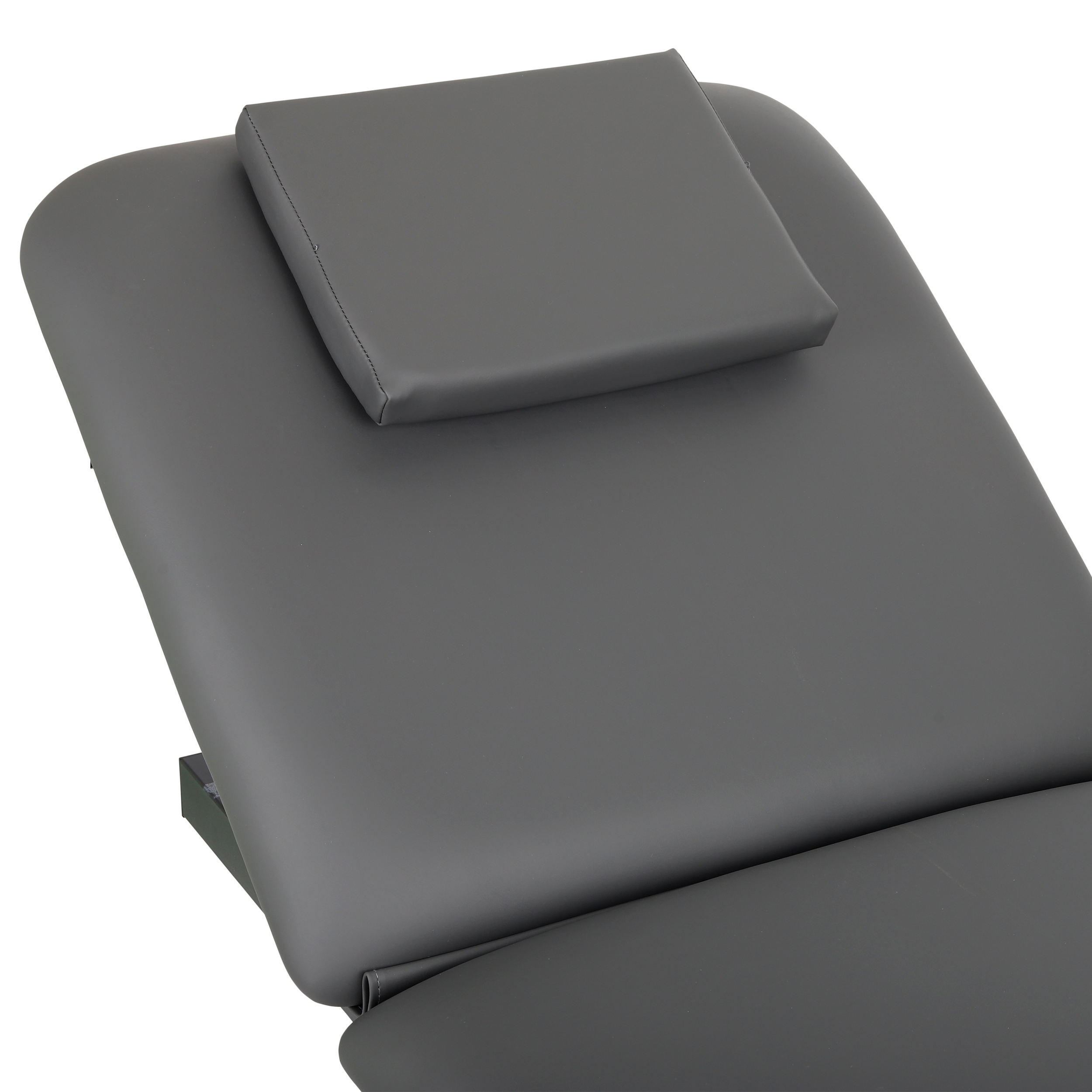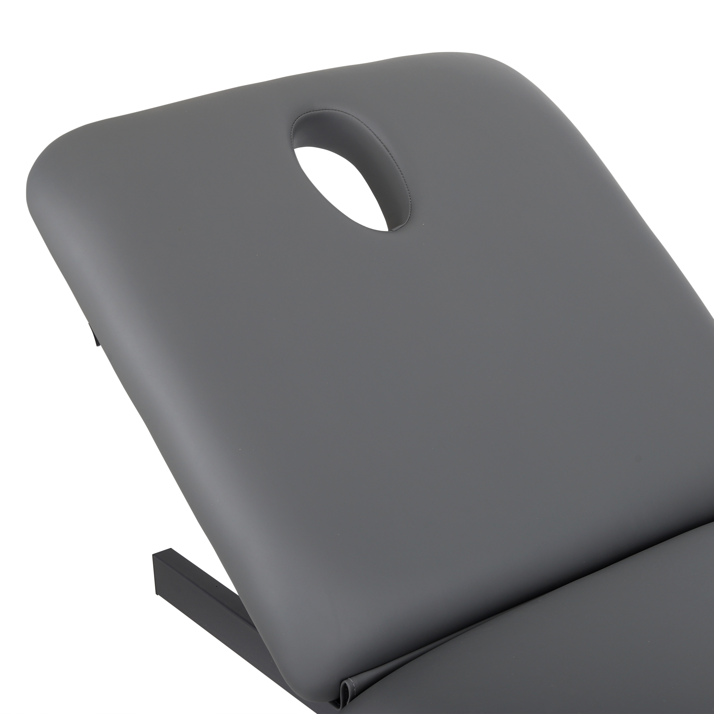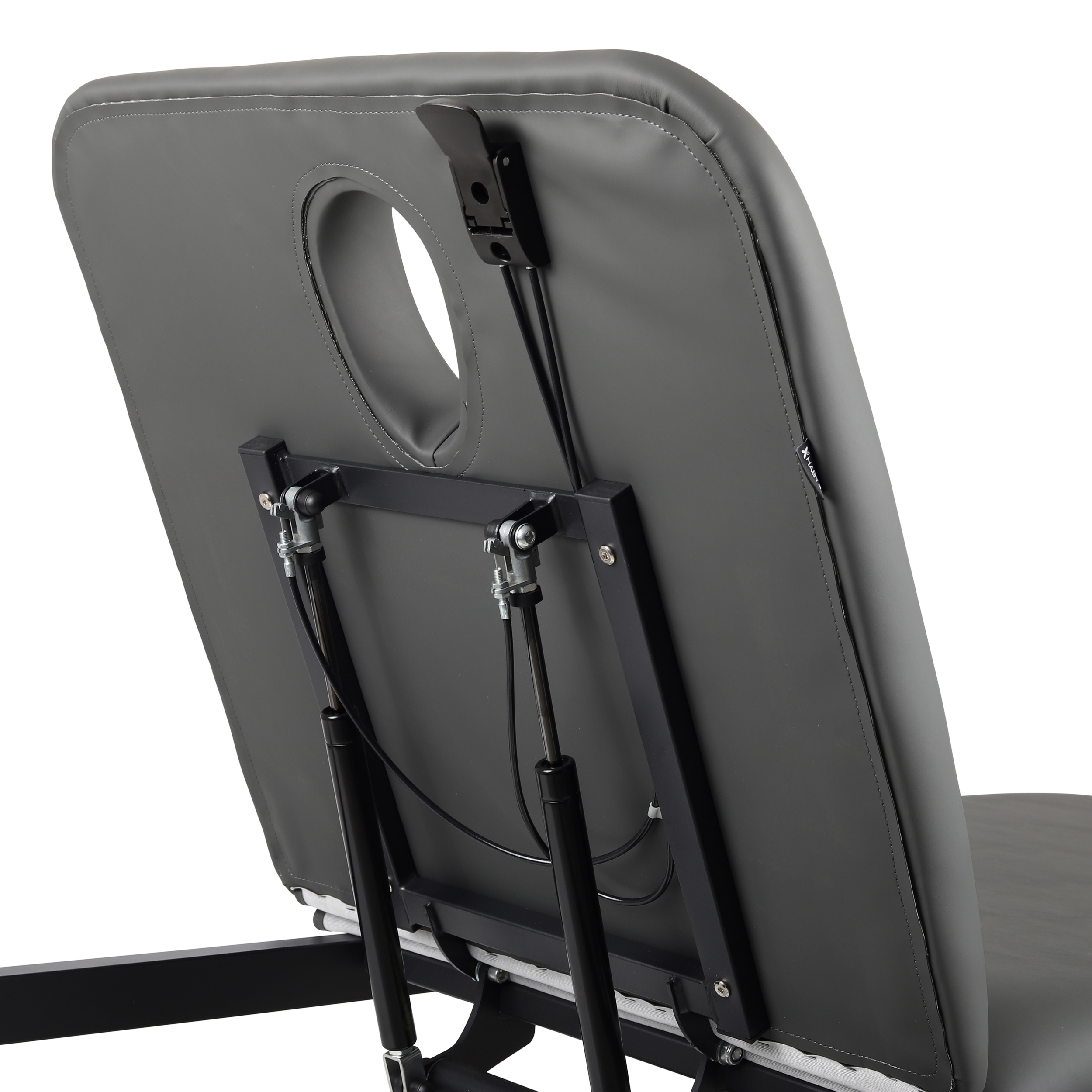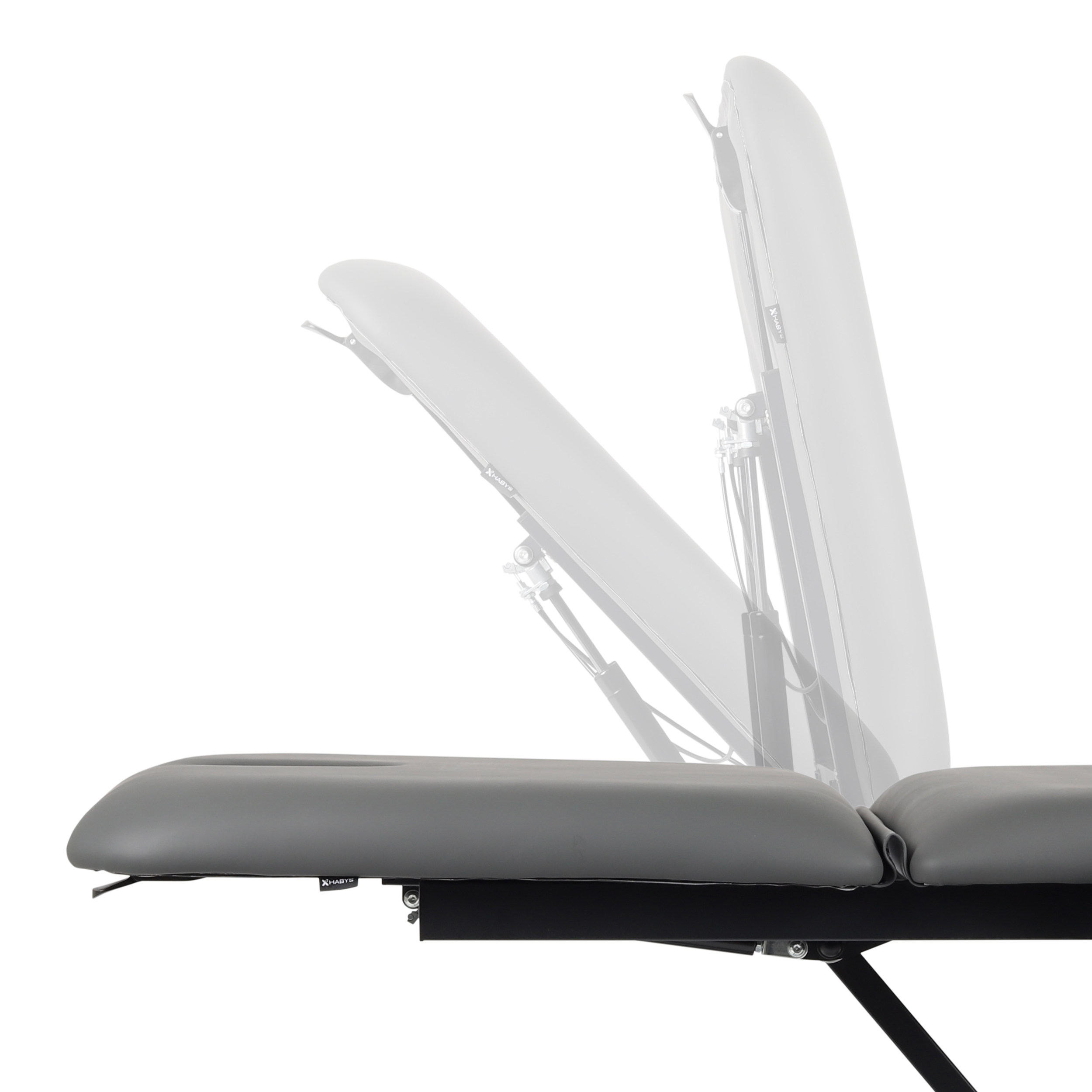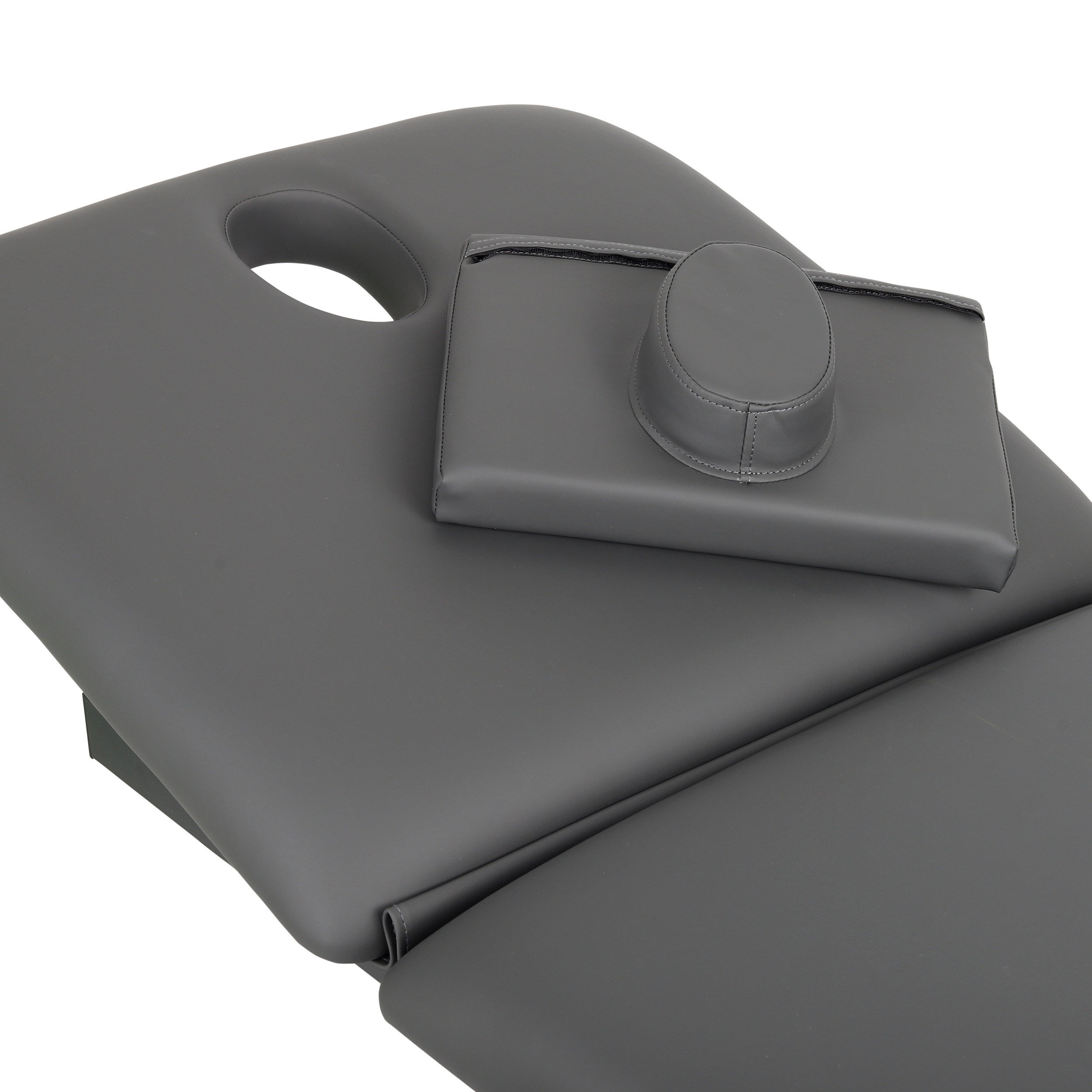 • Regulējams atzveltnes slīpums ar sejas atveri un spilvenu: Regulācija ar gāzes atsperi nodrošina klusu un precīzu pacienta pozicionēšanu. Sejas atvere ļauj brīvi elpot guļus pozīcijā, bet lielais spilvens nodrošina komfortu, kad atvere nav nepieciešama.